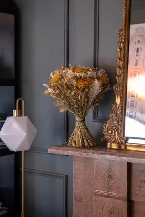 When my floral arrangements arrived from Paris, I knew exactly where to place them. In the morning, our front room is flooded with light, and the fireplace mantle has an empty spot just next to our Parisian-inspired gold mirror. The yellow flowers in this Esmée bouquet caught my eye immediately. You can play with additional accessories to balance out the layers of the mirror and floral arrangement.