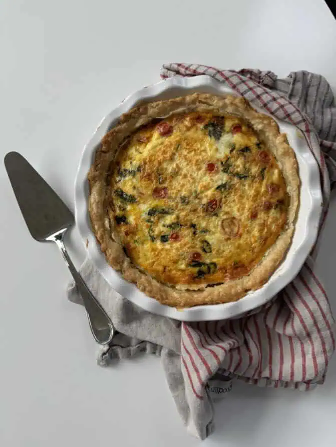 For this quiche, I used cherry tomatoes, spinach, and feta. I used this Emile Henry pie pan. You can also use a tart pan, which is shallower and requires fewer eggs. Since the pan is thicker, I used a dozen eggs for this quiche.