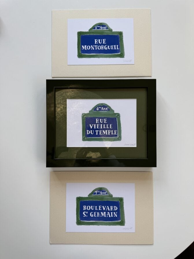 Custom Paris street signs for a Paris small business. My friend Sonja created the Paris map in my book and creates these beautiful Paris street signs. Frame your favorite Paris street. The prints come unframed. I framed mine via Framebridge.