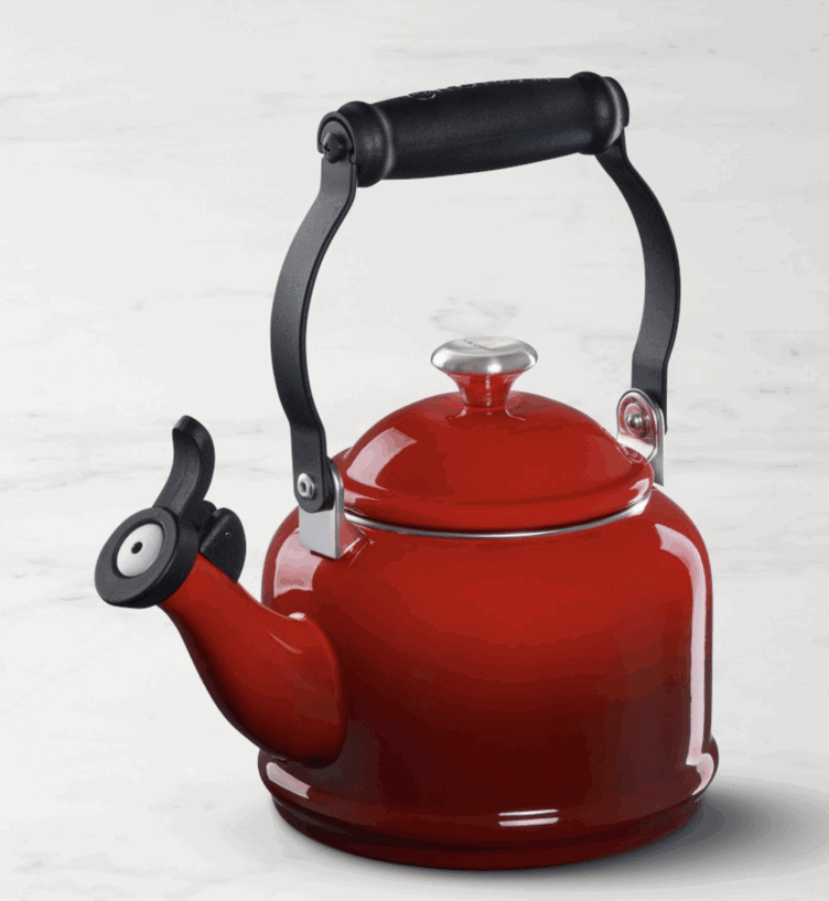 We have owned this Le Creuset tea pot for years. It holds up well and comes in a variety of colors. Perfect for boiling hot water for tea season.