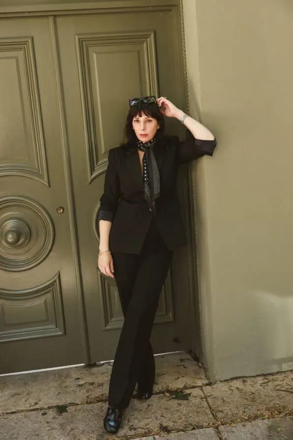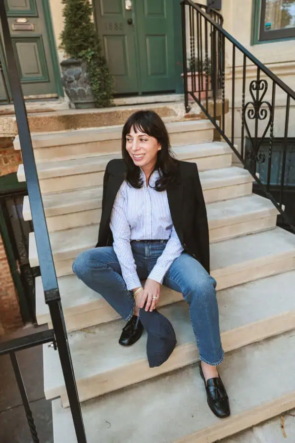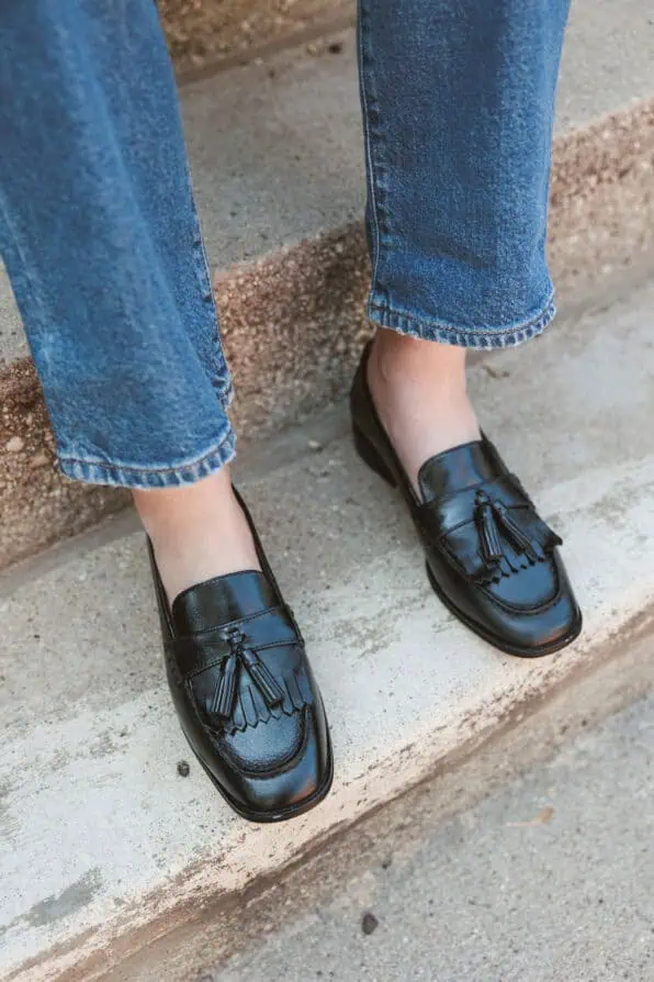 Who doesn’t love a power suit? I paired a black blazer with these black pants, which are just perfection. The pleat down the front makes them super flattering, and they are comfortable. To make it simple, I paired the same black loafers with the suit. I am 5’6” and no tailoring required. You could easily throw on your favorite black booties or heels with this, too.