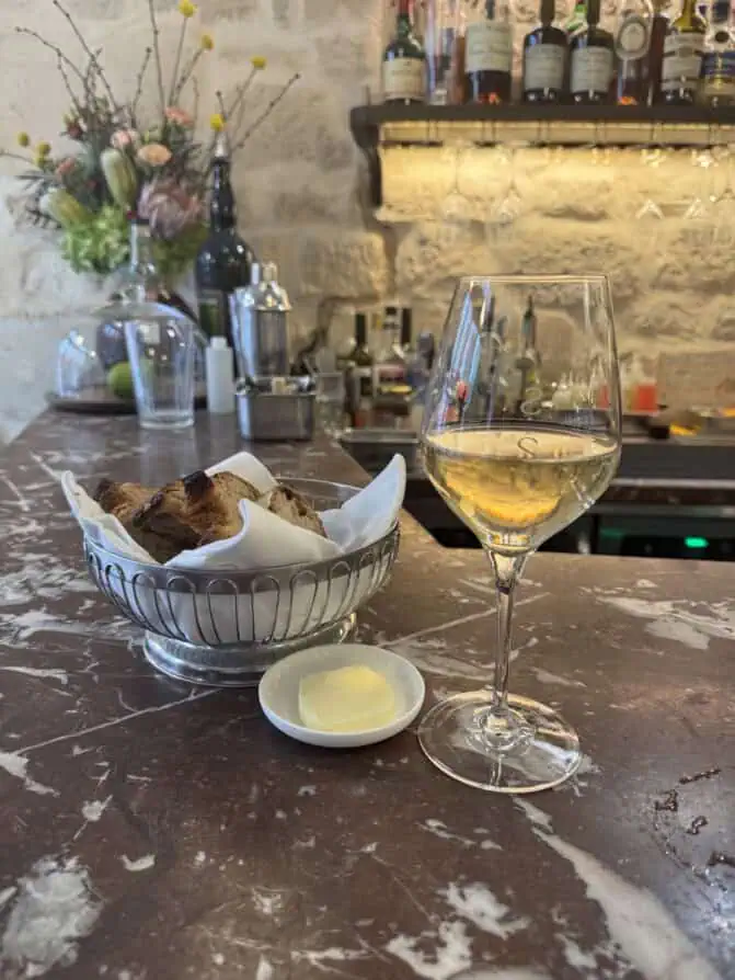 Bistro des Tournelles is an excellent spot for a solo dinner in Paris. Just around the corner from Place des Vosges, you will find the bistro on the side street of Rue des Tournelles. I have dined here solo a few times at the bar. There are just a few spots at the bar at Bistro des Tournelles, making it a prime spot for solo diners. I am sharing my secret to some of the best people-watching in the Marais. The bar is located just by the front door, and you will see well-dressed Parisians and tourists come in and out. Many walk-ins try for a table, but they are always fully booked. You will want to make sure you have a reservation, even if it is just for one person, for bar seating.
