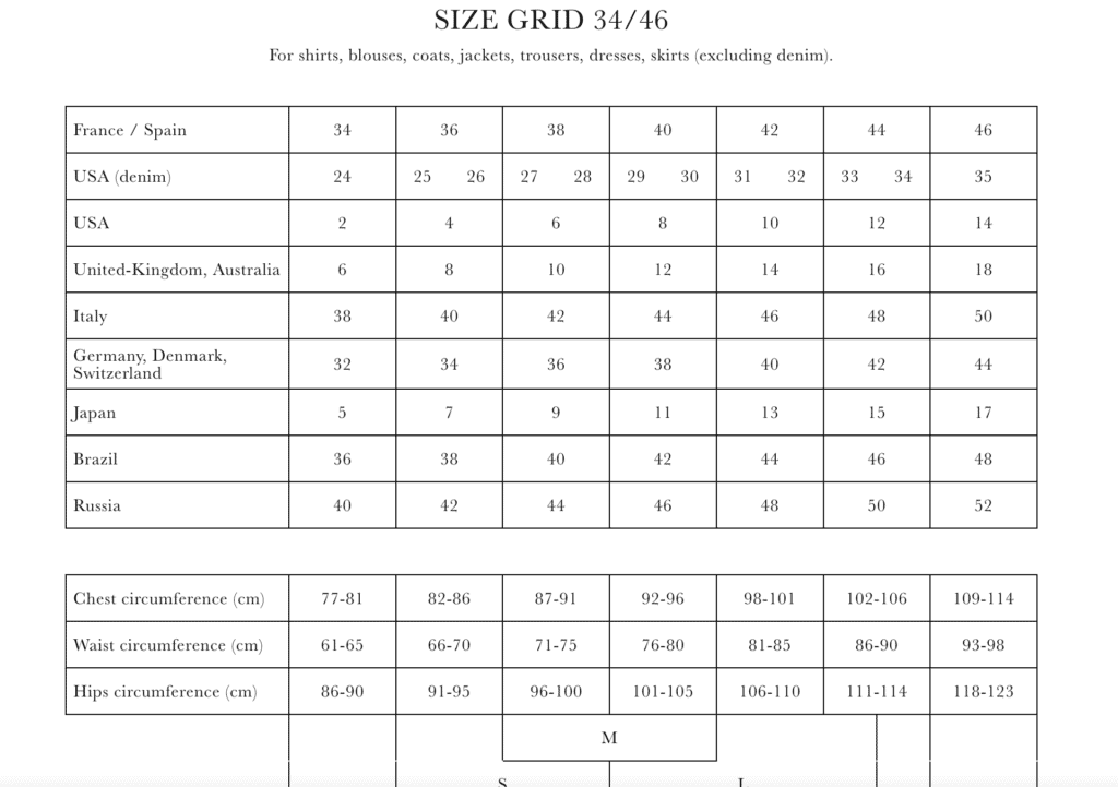 The Sézane site offers this helpful sizing guide as seen below.