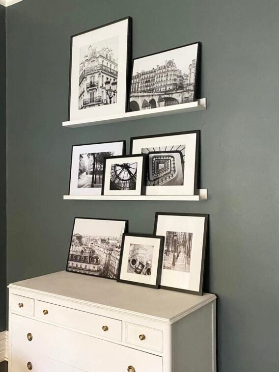 I have been dreaming of a Black and White Paris Gallery Wall for years. It took a move and a Pandemic to finally make it happen. Originally, this wall was going to have a TV and a console underneath, but my dresser ended up fitting the space better and I didn’t really want a TV on the wall in the room I call the library. This is where I read the paper, drink coffee, and work from the couch. (shh!)
