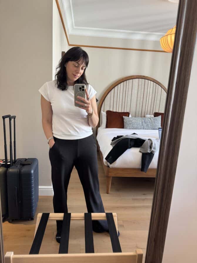 I highly recommend packing at least one coat for Paris. A trench coat is a classic French wardrobe staple, and you will see Parisian women wearing trench coats on sunny and rainy days. This isn’t just a raincoat; it is a style statement. Since the early mornings and evenings can get cold, I recommend packing a light or silk scarf as a layering accessory. A leather jacket isn’t a bad idea, and you will find another classic French staple piece in Parisian fashion. I purchased mine from Madewell a few years ago and have gotten so much use from it over the years. (sized up to a medium)