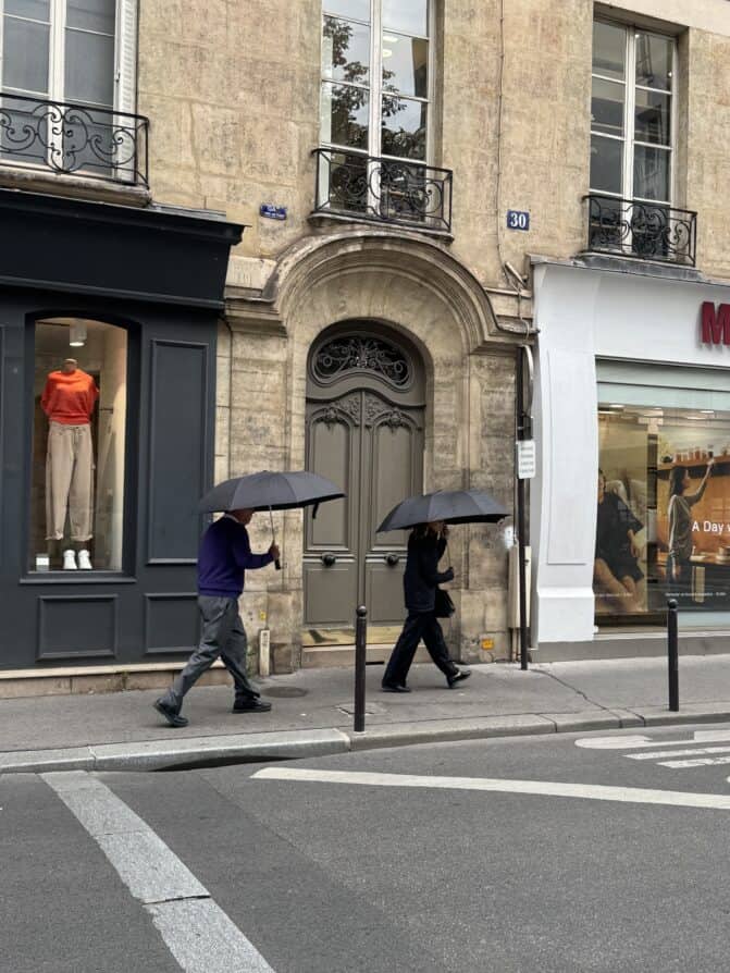 You may be surprised, but fanny packs are trending in Parisian fashion. They are called “banane” because they are shaped like a banana. I own a bag by the famous French brand Rive Droite, which you will see all over Paris. You can buy one at their store in the Marais or at Galleries Lafayette, where I purchased mine.